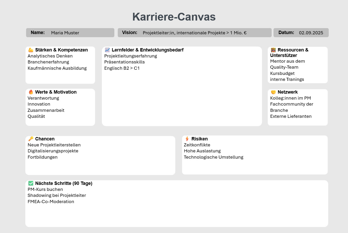 So setzt Du’s um: Erstelle ein Canvas, fülle jedes Feld stichpunktartig, hänge es sichtbar auf und aktualisiere quartalsweise. Das Ganze funktioniert wie eine Landkarte für deinen beruflichen Weg.