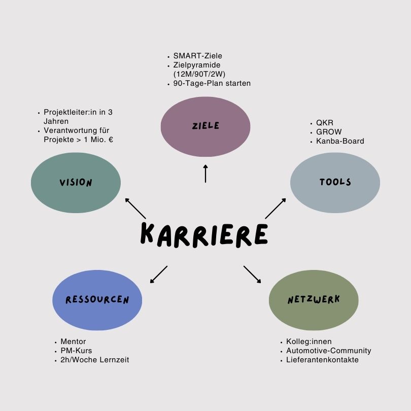 Mit einem Mindmap bringst du deine Gedanken visuell in Ordnung. Ausgehend von einem zentralen Thema – etwa deiner Karriere – verzweigen sich Unterthemen wie Vision, Ziele, Ressourcen oder Netzwerk. So erkennst du Zusammenhänge auf einen Blick, sammelst Ideen strukturiert und schaffst dir eine kreative Grundlage für die nächste Planung. Manchmal ist es einfacher, Gedanken frei zu sortieren. Mit einem Mindmap (z. B. auf Papier oder mit Tools wie MindMeister oder XMind) kannst du deine Ideen sammeln: