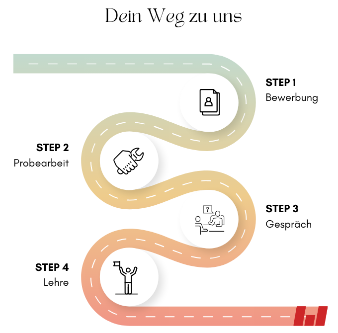 Gespräch: Wir treffen uns und reden über die Ausbildung. Wenn du noch nicht volljährig bist, sollen deine Erziehungsberechtigten auch dabei sein. Wir beantworten alle Fragen.